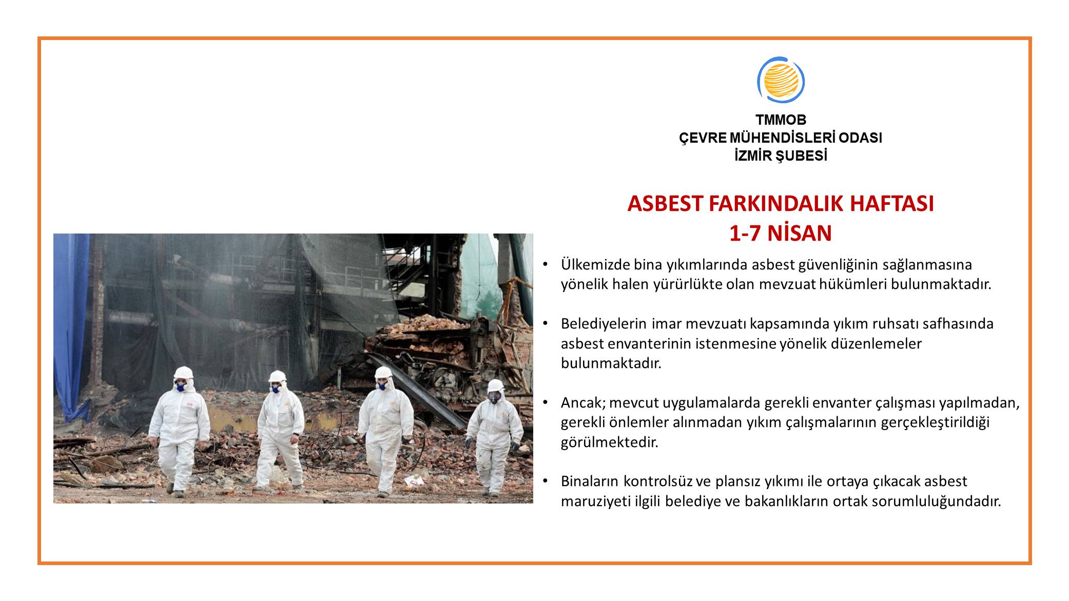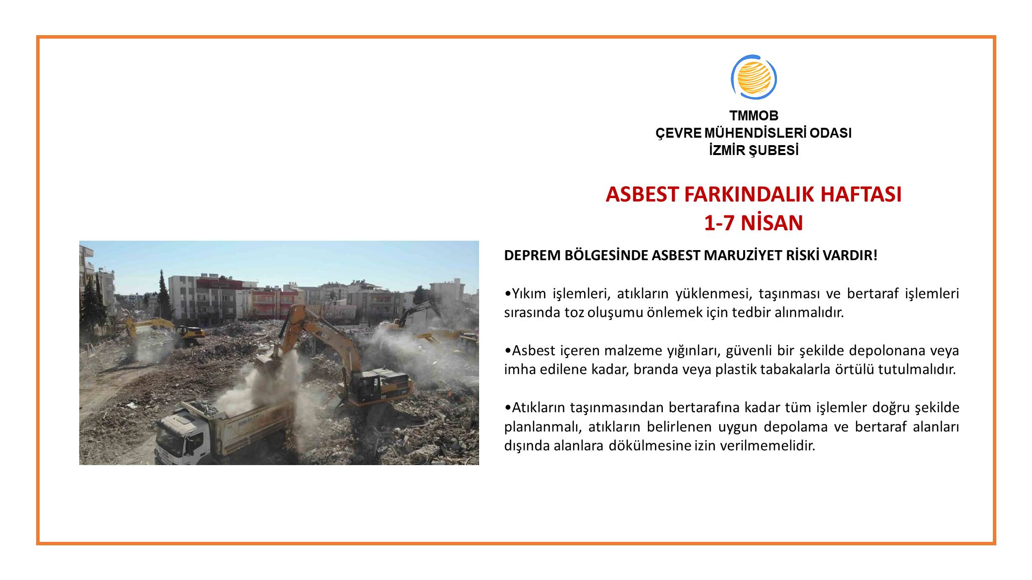 Deprem ve yıkıntı atıkları ile birlikte asbest tehlikesi de gündemdeki yerini korumaya devam ediyor. Asbeste maruz kalma ve asbest kaynaklı hastalıkları önlemeye adanmış "Küresel Asbest Farkındalık Haftası" nda; bina yıkımı ve asbest maruziyet riskine tekrar dikkat çekmek gerekmekte…