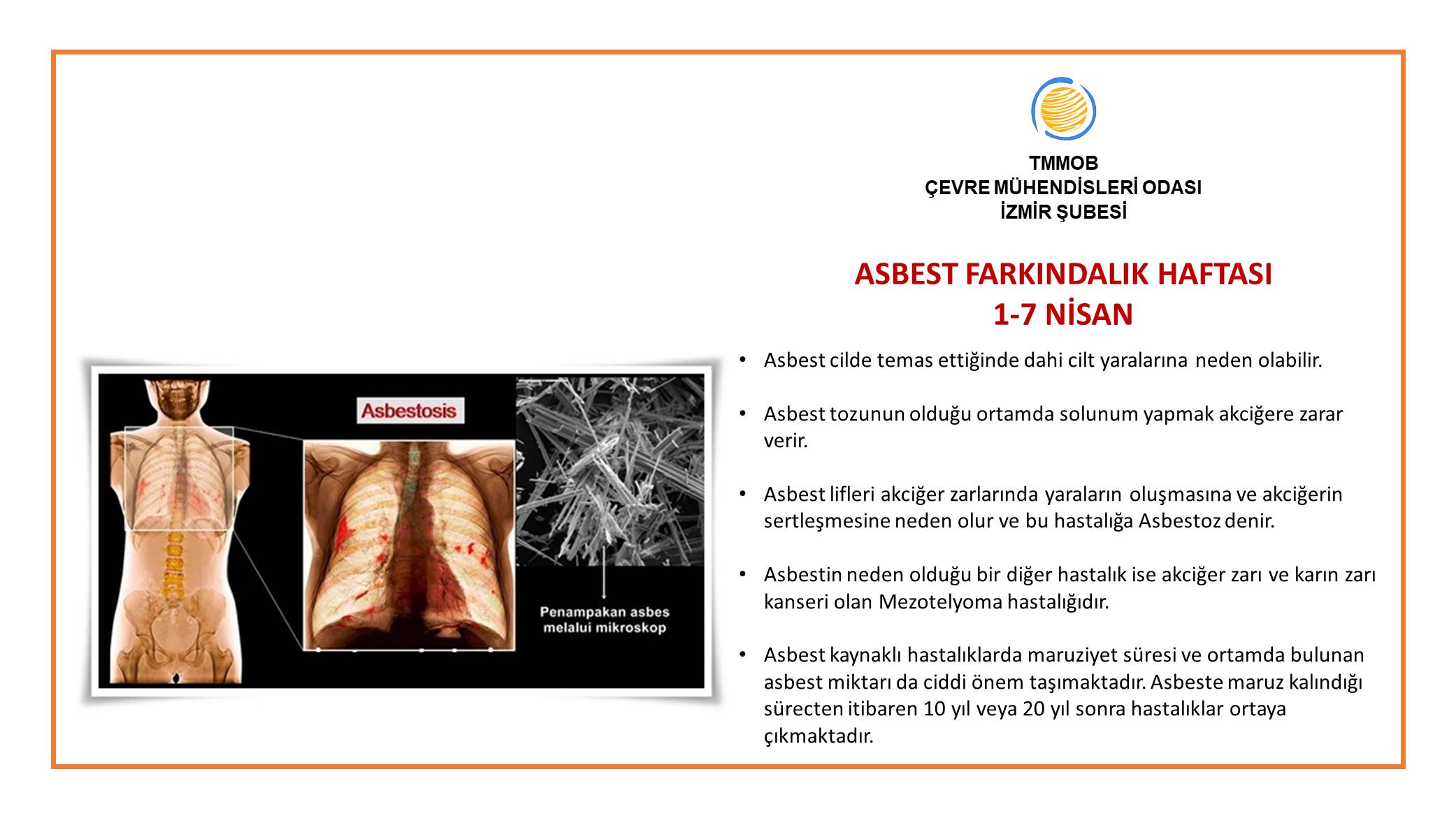 Asbest, solunum ya da içme suyuyla vücuda girdiğinde başta kanser olmak üzere çeşitli hastalıklara yol açar. Asbest lifleri havayla alındığında bu liflerin büyük bölümü hava yolları hücrelerinde birikir. Deprem sonrası yıkım süreçlerinde ve kentsel dönüşüm uygulamalarında asbest kaynaklı en önemli risk asbest tozlarının havaya salınmasıdır.