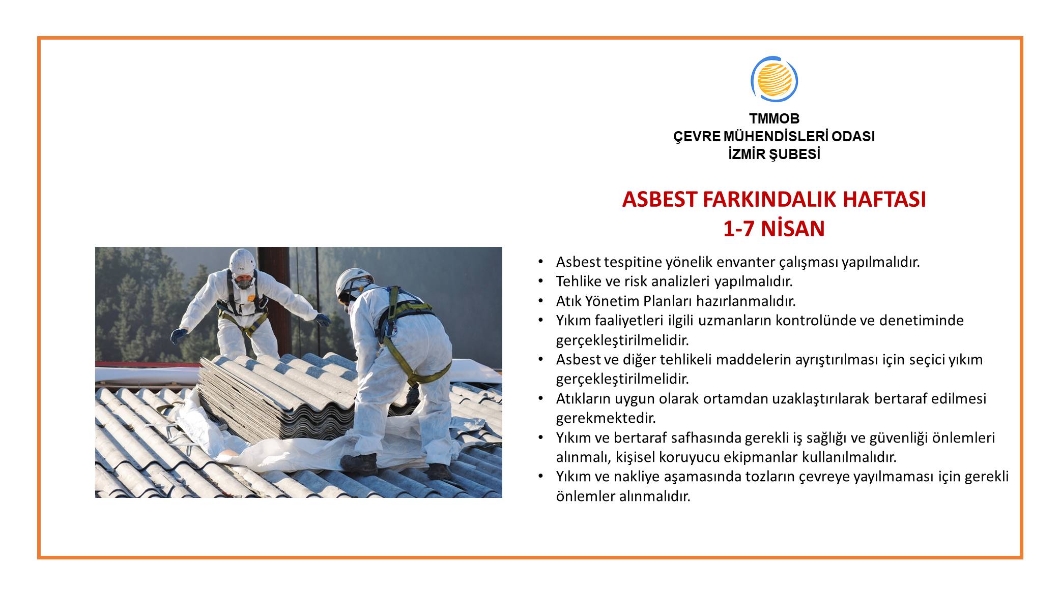 Asbestin, binaların yıkımı safhasında ayrıştırılması ve bertarafı ile ilgili oluşabilecek çevresel risklerin doğru yönetilmesi önem taşımaktadır. Bu sürecin özel yöntemlerle, çalışanlar için kullanılacak özel ekipmanlarla çevre ve insan sağlığına zarar vermeyecek şekilde önlemlerinin alınarak gerçekleştirilmesi, oluşan atıkların tekniğine uygun olarak bertaraf edilmesi gerekmektedir.