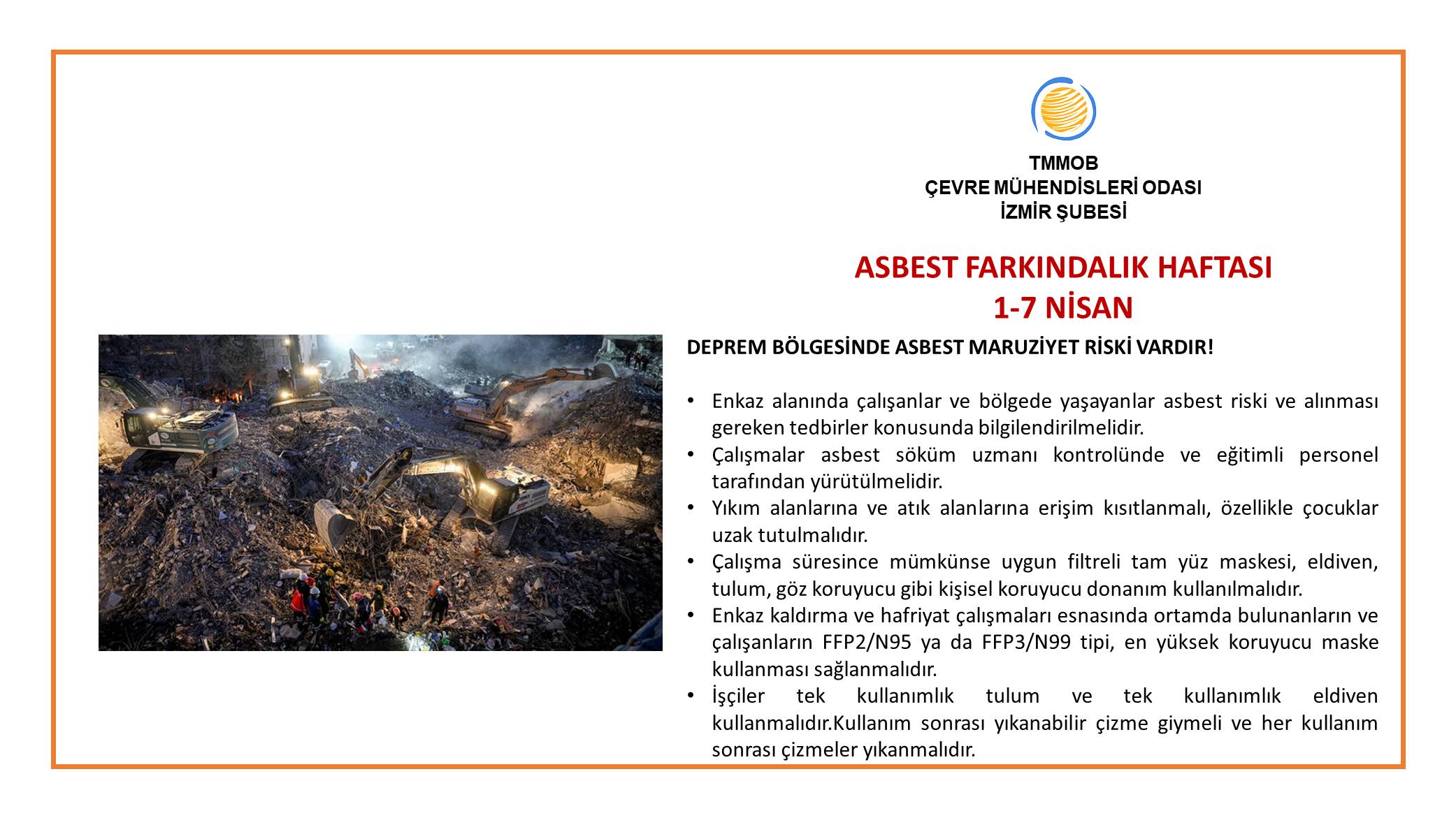- Enkaz alanında çalışanlar ve bölgede yaşayanlar asbest riski ve alınması gereken tedbirler konusunda bilgilendirilmelidir.