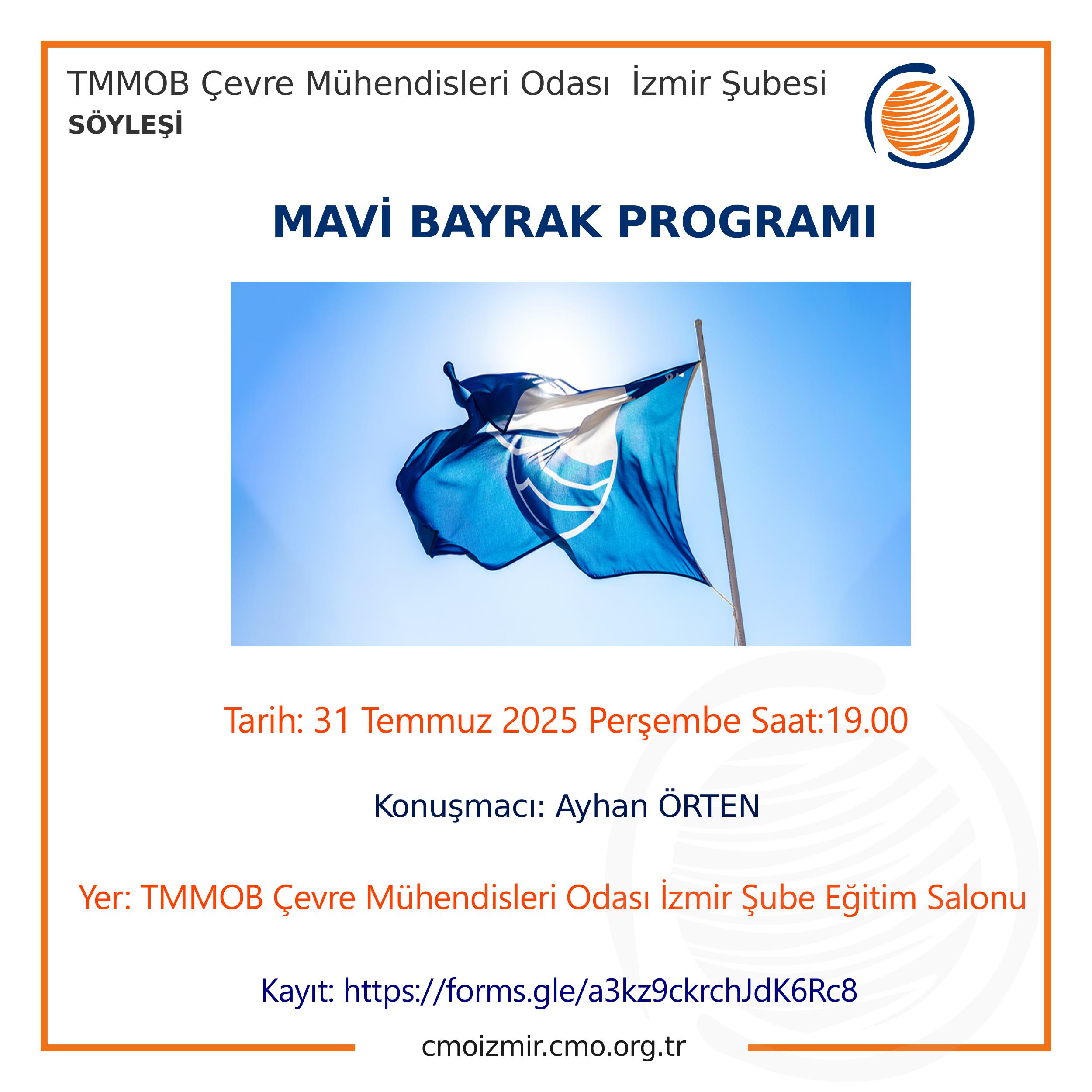 Şubemiz tarafından 31 Temmuz 2025 perşembe günü "Mavi Bayrak Programı" konusu ile Şubemiz Eğitim Salonunda mesleki söyleşi düzenlenecektir.