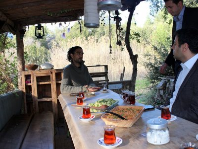 ÇMO Başkanı Bozoğlu, on yıl önce sistemin sunduğu şekilde değil kendi istedikleri şekilde yaşamak için İstanbul`u terk ederek vadiye yerleşen Birhan ve Tuğba`ya konuk oldu. İkili tarafından oldukça sıcak karşılanan Bozoğlu ve beraberindekiler, yeryüzü evi adı verilen ve ikilinin tamamen doğadaki malzemelerden inşaa ettikleri ‘yuva‘larını gezdi. Daha sonra ikram edilen çay eşliğinde ikiliye sorular yönelten ÇMO Başkanı, oraya nasıl ve neden geldikleri, evlerini nasıl yaptıkları ve tarımsal çalışmaları hakkında bilgi aldı.