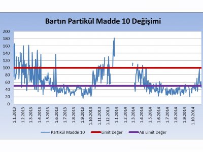 Çevre ve Şehircilik Bakanlığı`nın Bartın merkezde kurduğu hava izleme noktasının verilerine göre Bartın`da özellikle kış aylarında Partikül Madde 10 (PM10) olarak adlandırdığımız kirletici parametrenin oldukça yüksek olduğu görülmektedir. Kömür kullanımı ve ulaşımdan kaynaklı olan bu kirlilik Bartın`lıların sağlığını tehdit etmektedir.