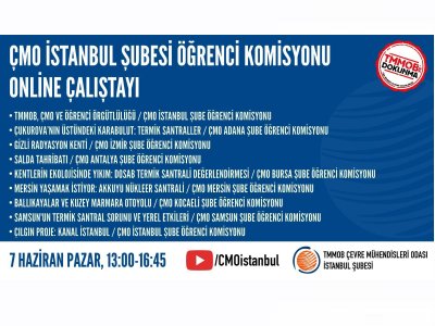 Şubemiz Öğrenci Komisyonu Başkanı Fatmagül DEHKAN ve Komisyon Üyesi Yusuf ESER, Çevre Mühendisleri Odası İstanbul Şubesi Öğrenci Komisyonu tarafından 7 Haziran 2020 tarihinde düzenlenen online çalıştaya katılım sağladı. Salgın süreci dolayısıyla evlerinde kalarak çalıştaya katılan öğrenci üyelerimiz "Salda Tahribatı" isimli sunumla çalıştaya katkıda bulundu. Emeklerinden dolayı Şubemiz Öğrenci Komisyonuna ve Çevre Mühendisleri Odası İstanbul Şubesi Öğrenci Komisyonuna teşekkür eder, Odamız İstanbul Şubesine adımıza dikilecek fidan için minnettarlığımızı iletiriz.