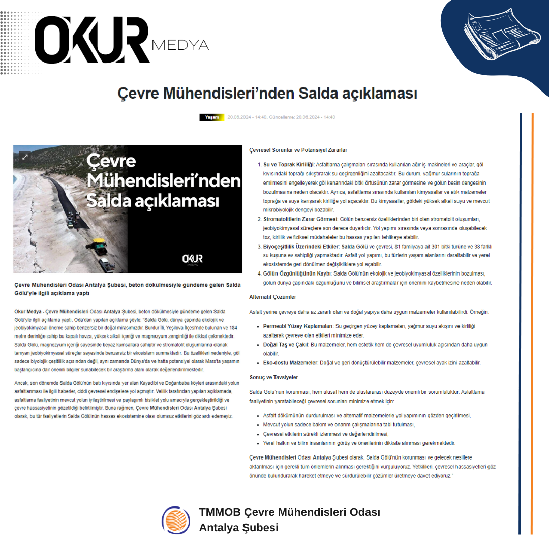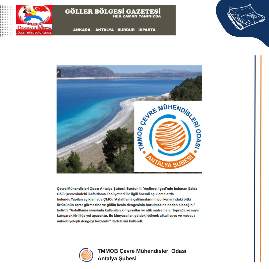Yapılan açıklamada, Salda Gölü'nün dünya çapında ekolojik ve jeobiyokimyasal öneme sahip benzersiz bir doğal miras olduğu vurgulayan Çevre Mühendisleri Odası Antalya Şubesi, Burdur ili, Yeşilova ilçesinde bulunan ve 184 metre derinliğe sahip olan bu kapalı havzanın, yüksek alkali içeriği ve magnezyum zenginliği ile dikkat çektiği belirterek, “Salda Gölü, magnezyum içeriği sayesinde beyaz kumsallara sahiptir ve stromatolit oluşumlarına olanak tanıyan jeobiyokimyasal süreçler sayesinde benzersiz bir ekosistem sunmaktadır. Bu özellikleri nedeniyle, göl sadece biyolojik çeşitlilik açısından değil, aynı zamanda Dünya'da ve hatta potansiyel olarak Mars'ta yaşamın başlangıcına dair önemli bilgiler sunabilecek bir araştırma alanı olarak değerlendirilmektedir” ifadelerine yer verdi. Açıklamada, Salda Gölü'nün sadece biyolojik çeşitlilik açısından değil, aynı zamanda Dünya'da ve potansiyel olarak Mars'ta yaşamın başlangıcına dair önemli bilgiler sunabilecek bir araştırma alanı olarak değerlendirildiği ifade eden Çevre Mühendisleri Odası Antalya Şubesi,son dönemde, gölün batı kıyısında yer alan Kayadibi ve Doğanbaba köyleri arasındaki yolun asfaltlanması ile ilgili haberlerin ciddi çevresel endişelere yol açtığı belirterek, “son dönemde Salda Gölü’nün batı kıyısında yer alan Kayadibi ve Doğanbaba köyleri arasındaki yolun asfaltlanması ile ilgili haberler, ciddi çevresel endişelere yol açmıştır. Valilik tarafından yapılan açıklamada, asfaltlama faaliyetinin mevcut yolun iyileştirilmesi ve paylaşımlı bisiklet yolu amacıyla gerçekleştirildiği ve çevre hassasiyetinin gözetildiği belirtilmiştir. Buna rağmen, Çevre Mühendisleri Odası Antalya Şubesi olarak, bu tür faaliyetlerin Salda Gölü'nün hassas ekosistemine olası olumsuz etkilerini göz ardı edemeyiz” açıklamalarına yer verildi.