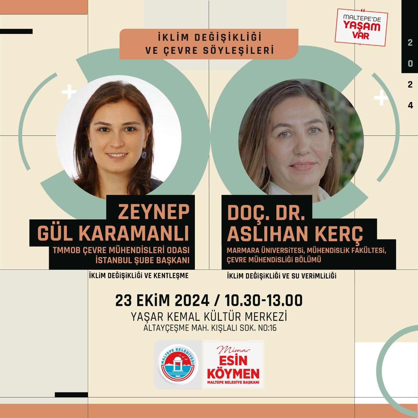 Dünya İklim Değişikliği ile Mücadele Günleri kapsamında 23.10.2024 tarihinde Maltepe Belediyesince düzenlenen Marmara Üniversitesi Çevre Mühendisliği bölümü Öğretim Üyesi Doç. Dr. Aslıhan Kerç ve ÇMO İstanbul Şube Başkanı Zeynep Karamanlı’nın konuşmacı olarak yer aldığı söyleşide iklim değişikliğinin su varlıkları ve kentleşme ile ilişkisi ele alındı.