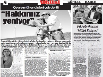 Şubemiz Yönetim Kurulu Başkanı Derya Ünver, 15 Kasım`da Antalya Hilal Gazetesi`ne açıklamalarda bulundu. Mesleğimizin önemine dikkat çeken Ünver, Çevre Mühendisliği disiplini hakkında bilgiler aktardı. Çevre görevlisi konusunda ve meslektaşlarımızın çalışma hayatında yaşadıkları sıkıntılar konusunda açıklamalarda bulunan Ünver`in röportajı 16 Kasım`da Hilal Gazetesi`nde yayınlandı.