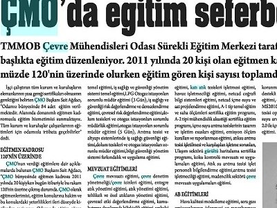 ÇMO da eğitim seferberiği TMMOB Çevre Mühendisleri Odası Sürekli Eğitim Merkezi tarafından 84 farklı başlıkta eğitim düzenleniyor. 2011 yılında 20 kişi olan eğitmen kadrosu günümüzde 120‘nin üzerinde olurken eğitim gören kişi sayısı toplamda 13 bini buldu İşçi çalıştıran tüm kurum ve kuruluşların elemanlarının yasa gereği sertifikalan olmasının gerektiğini belirten ÇMO Başkam Sait Ağdacı, "Odamız bünyesinde 84 adet eğitim verilmektedir. Alanında donanımlı eğitmen kadromuzla eğitim hizmetimizi sunmaktayız. Tüm kurum ve kuruluşlar çalışanlarının eğitimleri için odamızla irtibata geçebilirler" dedi.