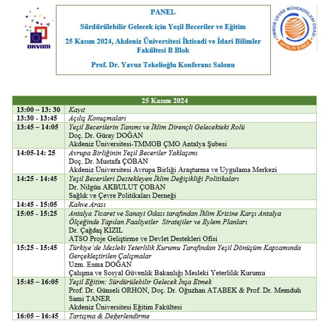 25 Kasım 2024 tarihinde Pazartesi günü TMMOB ÇMO Antalya Şubesi ve Akdeniz Üniversitesi Avrupa Birliği Araştırma ve Uygulama Merkezi (AKVAM) işbirliği ile Akdeniz Üniversitesi İktisadi ve İdari Bilimler Fakültesi B Blok'ta yer alan Prof. Dr. Yavuz TEKELİOĞLU Konferans Salonunda 13.00-17.00 saatleri arasında gerçekleştireceğimiz Sürdürülebilir Gelecek için Yeşil Beceriler ve Eğitim Paneline davetlisiniz.