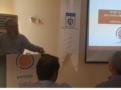 İzmit Körfezinde alg patlaması nedenleri ve çözüm önerilerinin konuşulduğu panelde açılış konuşmasını yapan Şube Başkanımız Sait Ağdacı daha sonra Alglerın yapısıyla ile ilgili "Algler tek hücreli olup güneş ışığında büyüyor. Tek bir hücre 2 hafta içinde milyonlarca çoğalabiliyor bu da insan ölümlerine neden oluyor, denizin yapısı bozuluyor. Körfezde zehirlenmeler son yıllarda Nisan sonu Mayıs başı daha önceki yıllarda ise Haziran sonu Temmuz başı artış göstermiştir. Azot ve fosforun çok olması alglerin artışına neden oluyor. Besin oluşumu çok fazla olursa biyolojik bozulma meydana geliyor bu da ortamda ölüm tehlikesini ortaya çıkarıyor" bilgileri verdikten sonra, Marmara denizindeki alg patlaması ve ilimizde ki gelişimini "Marmarada 20 yılda bir görülürken bu sene 5ten fazla meydana geldi. Körfezde Azot ve fosfor fazlalığının en yoğun olduğu yer %25 ile Dilderesi mevkiidir. Kocaeli nüfus yoğunluğu bakımından çok yoğun bir kenttir. İl genelinde 20 adet atık su arıtma tesisi bulunuyor. Bunlar aylık sistem şeklinde düzenlenmesine rağmen uygulanmıyor" diye konuştu. Körfezin bütünleşik kıyı alanları tehditleri hakkında konuşan Ağdacı, "Körfez havzasının birinci derece deprem bölgesinde olması, sanayi yatırımlarının kentsel alanla iç içe olması, deniz trafiğindeki yoğunluk ve donanma gemilerinin dar koridorlarda seyretmek zorunda oluşu, su kaynaklarının büyümede yetersiz kalması ve ekoloji dengesinin kurulamaması" anlattı.