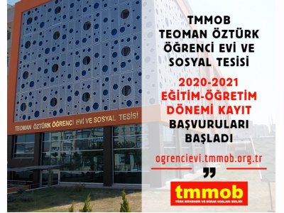 TMMOB Teoman Öztürk Öğrenci Evi ve Sosyal Tesisi 2020-2021 eğitim-öğretim dönemi için başvuru ve kayıtları başladı. Başvuru için tıklayınız...