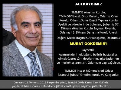Çevre Mühendisleri Odası İstanbul Şube VIII. Dönem Yönetim Kurulu Üyemiz Çağrı GÖKDEMİRin babası, TMMOB Yönetim Kurulu Üyeliği, İMO İstanbul Şube Yönetim Kurulu üyeliklerinde bulunmuş Murat GÖKDEMİRi kaybetmenin derin üzüntüsünü yaşıyoruz.