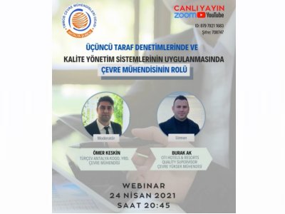 Webinarımız; 24 Nisan 2021 Tarihinde Saat:20.45`te Yönetim Kurulu Üyemiz Sn. Ömer Keskin Moderatörlüğünde, değerli meslektaşımız Sn Burak Ak`ın Konuşmacı Olarak Katılacağı Üçüncü Taraf Denetimlerinde Ve Kalite Yönetim Sistemlerinin Uygulanmasında Çevre Mühendisinin Rolü konusunda gerçekleştirilecektir.